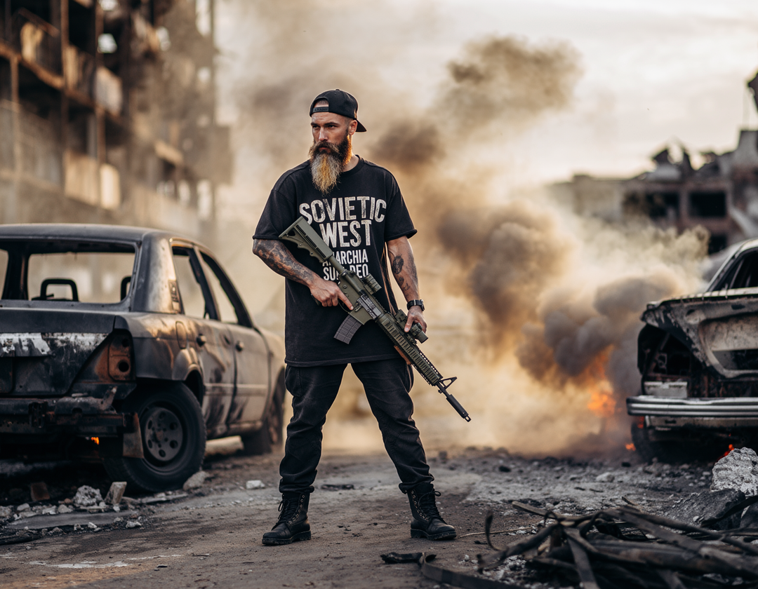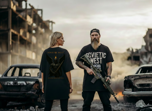 SOVIETIC WEST - Inspirada nos que resistiram no leste da Europa, contra a foice que os queria dobrar e contra o dólar que os queria comprar. Não servimos Moscou. Não servimos Wall Street. Somos a marcha solitária do pensamento livre. A contradição que caminha de cabeça erguida. Nascemos no meio do fogo cruzado, e fizemos do aço a nossa pele. Isso não é moda. É legado.